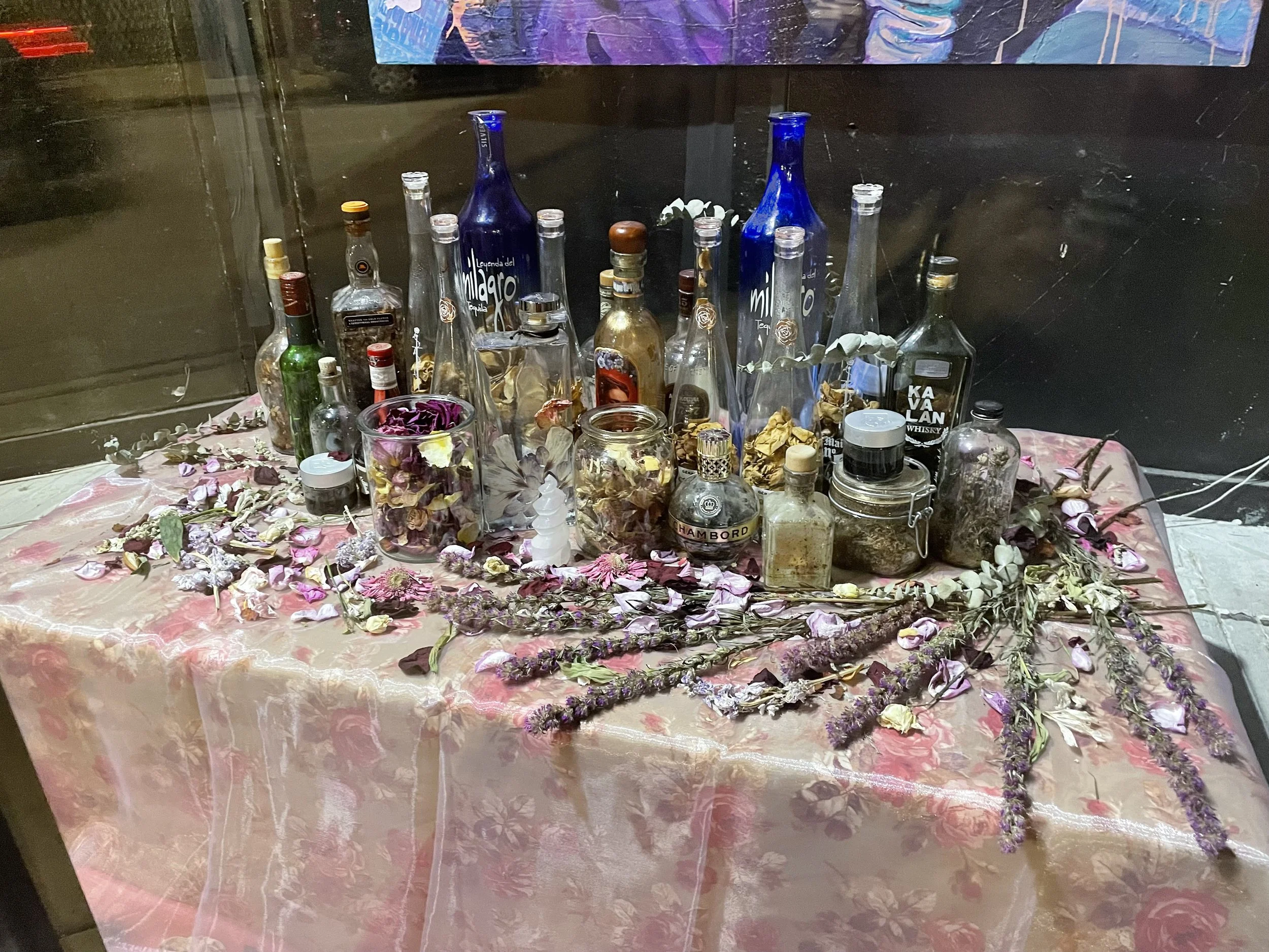 But fixed just to this display’s left is an altar: apothecary jars of different shapes and sizes, filled with alchemy; dried eucalyptus and rose petals, splatters of fried and faded menstrual blood. All manner of preserved natural matter inside tequila, rum and whiskey bottles. This space is interior, tender and powerful: and kept uninterrupted behind the glass of the gallery.